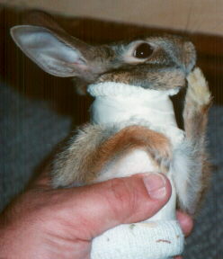 To make a dressing, we take four, 4" square (10cm x 10cm) sterile gauze pads and fold two together by folding the sides in to the center to make it 2" (5cm) wide, and 3" (7.5cm) long (the one end folds over about 1" (2.5cm.) We hold it together with small bits of tape. We take the other two pads, open them out to 4" x 8" (10cm x 20cm), and fold them individually into thirds length-wise, and use a bit of tape to hold them in that shape. Then we take one of two long pads and tape it in place on the back of the 2" by 3" (5cm x 7.5cm) double pad. When we place this on Peter's tummy with the folded-over edge of the 2" by 3" (5cm x 7.5cm) double pad on top (with the double pad face down), and to the rear of the wound, the long pad wraps completely around Peter, overlaps, and gives us a way to secure the small square pad over his wound without taping any part of the dressing to Peter's fur. Two pieces of adhesive tape go all the way around the dressing, securing it to Peter... well, sort of. Left alone, Peter will be out of it in about 30 seconds. The other long pad tapes to the dressing just over the wound, wraps aroung Peter's left hip (no leg!), snug to his bun "bun", but not covering his opening, around over his back to be taped down to the dressing. This extra "strap" lies right next to the edge of the dressing itself, we tape the two together and it forms a pocket that cups Peter's hip and bun. Then the dressing is taped to the edge of the "Sock Suit" with several full wraps of tape. So far, this arrangement has worked best. Keeps the wound completely covered, even with Peter flexing the little bit of bone and muscle that's left.