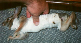 The piece of adhesive tape around Peter's middle was a "first try" thing, and we no longer use it. The tape at both ends, and behind the arms, seems to be sufficient. Peter's eaten his way out of one "Sock Suit", but that was due to my not securing the neck portion so that Peter couldn't get it in his mouth. Buns have amazing tongues!